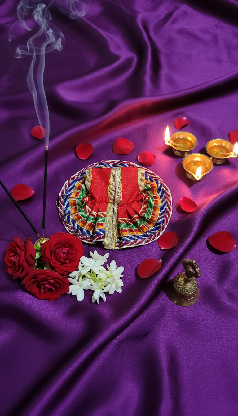 Vibrant Red and Gilded Dress: This beautiful dress for Laddu Gopal features a rich red center, framed by colorful, intricate embroidery. The combination of deep red and a spectrum of vibrant threads makes it a striking outfit.