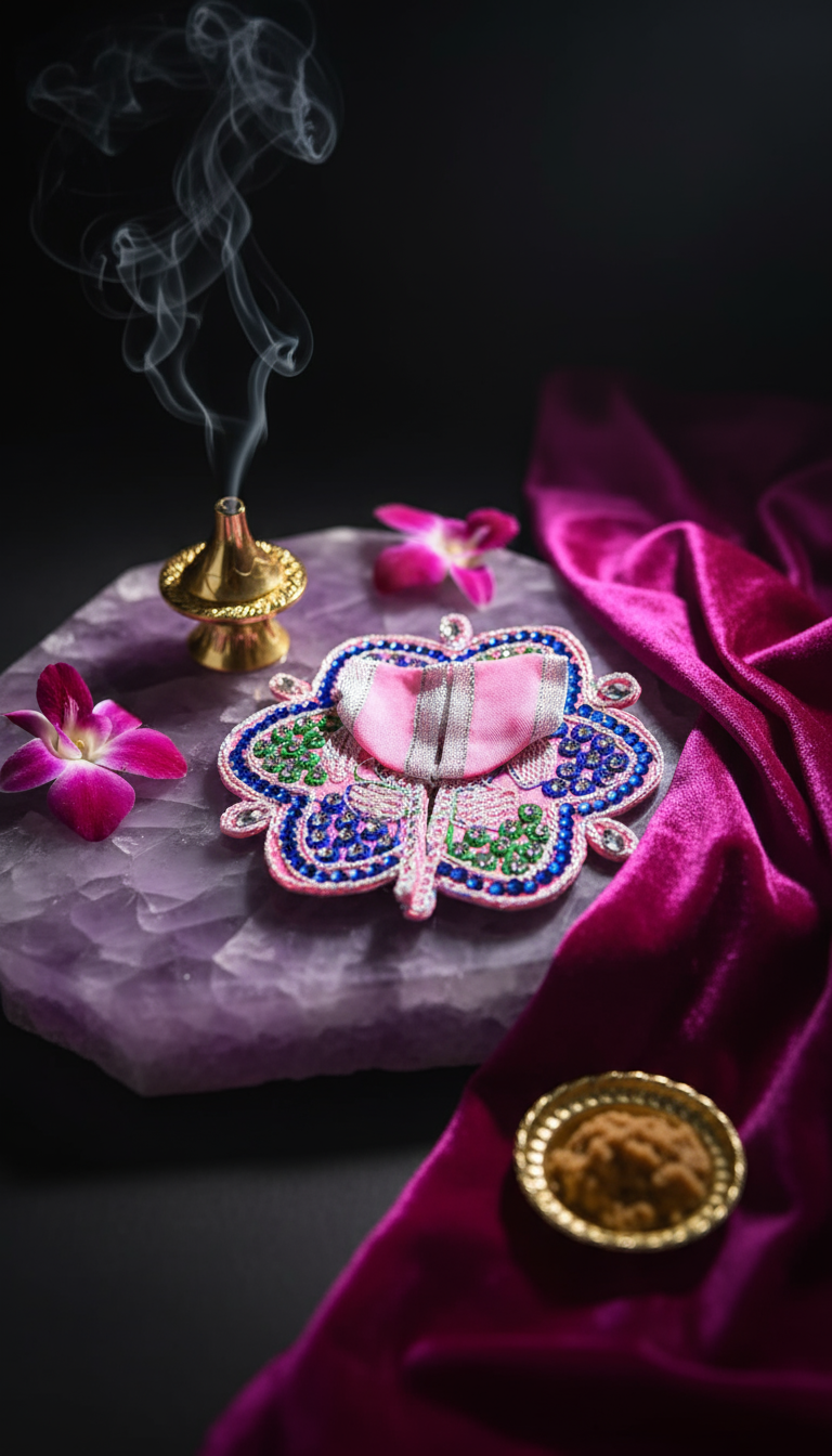Vibrant Color Palette: A harmonious blend of pink, blue, and green hues, complemented by a rich magenta velvet drape, makes this outfit truly stand out.