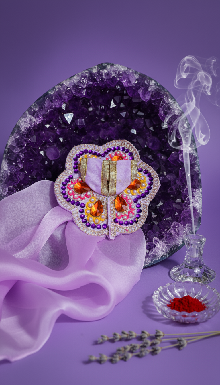 Rich Gemstone Embellishments: It is richly decorated with a mix of red and orange gems and intricate beadwork.