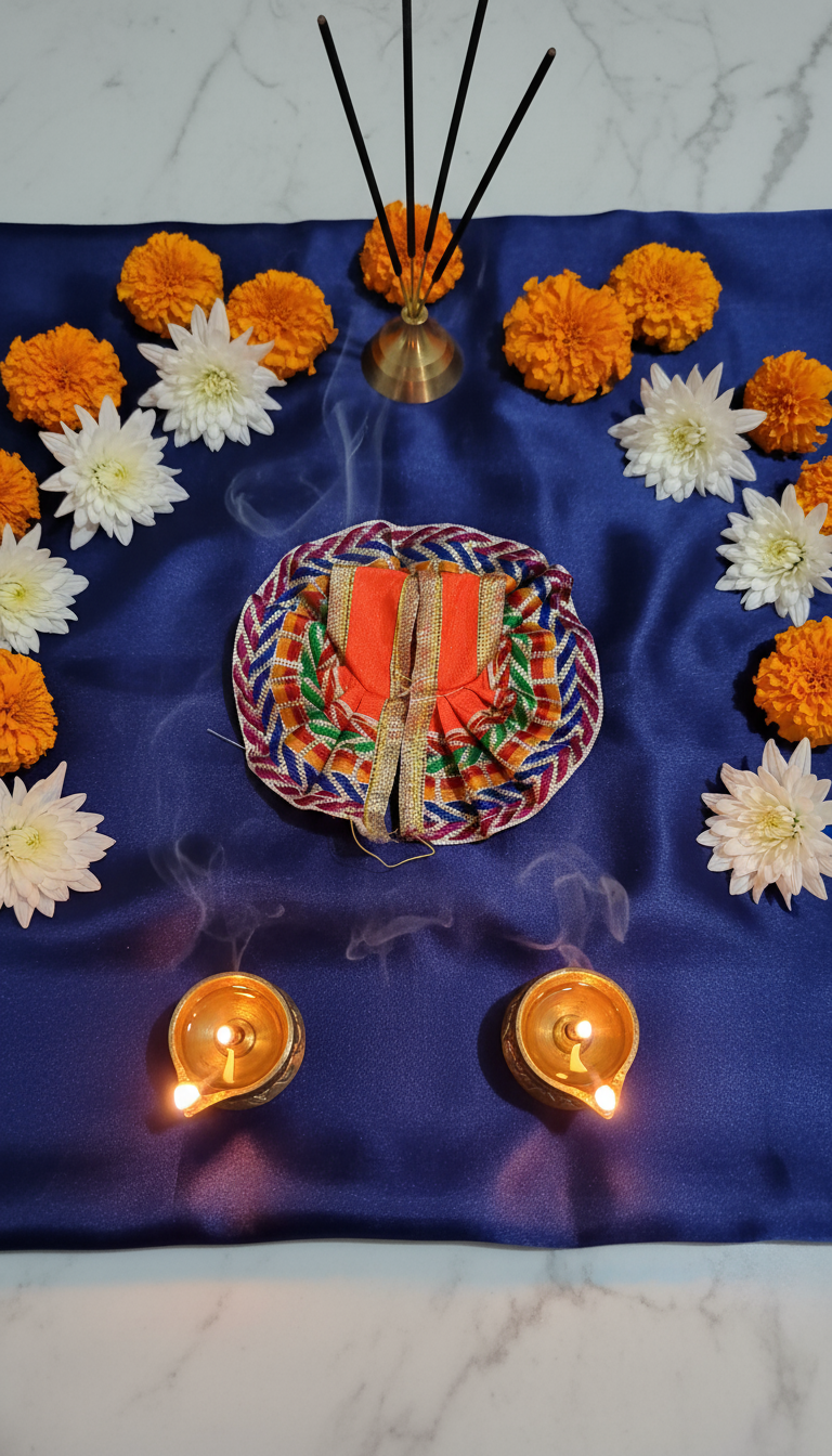 Vibrant Orange Dress: This beautiful dress for Laddu Gopal features a rich orange center, a color often associated with sacredness and energy. The striking hue is complemented by a lively, multicolored embroidered border.