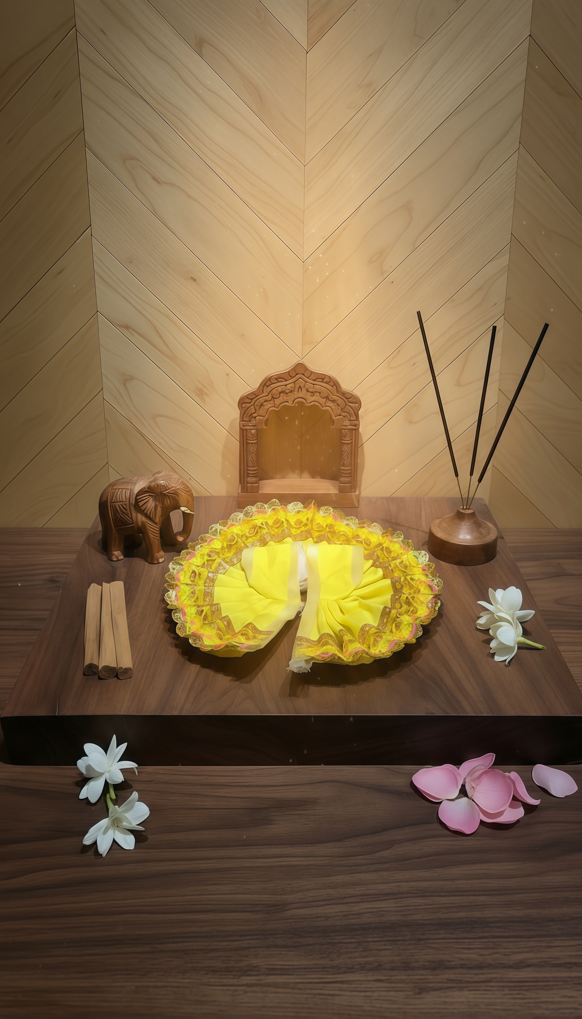 Vibrant Yellow Dress: This bright yellow dress for Laddu Gopal is beautifully crafted with intricate ruffles and delicate beadwork, creating a cheerful and divine look.