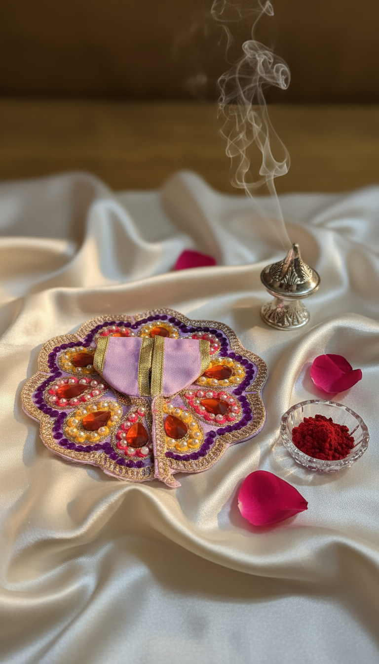 Rich Gemstone Embellishments: It is richly decorated with a mix of red and orange gems and intricate beadwork.