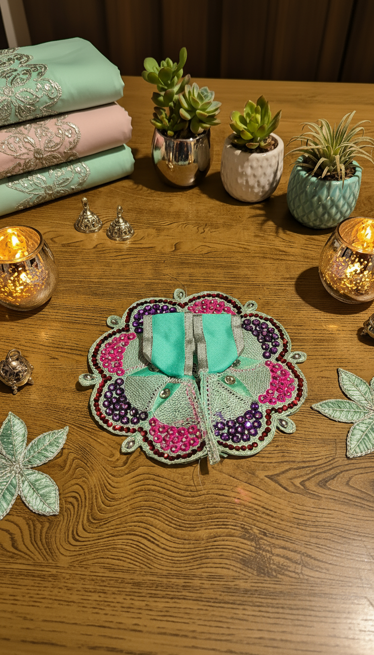 Rich Details: The outer design is beautifully adorned with intricate beadwork in shades of deep purple and magenta, adding a layer of rich color.