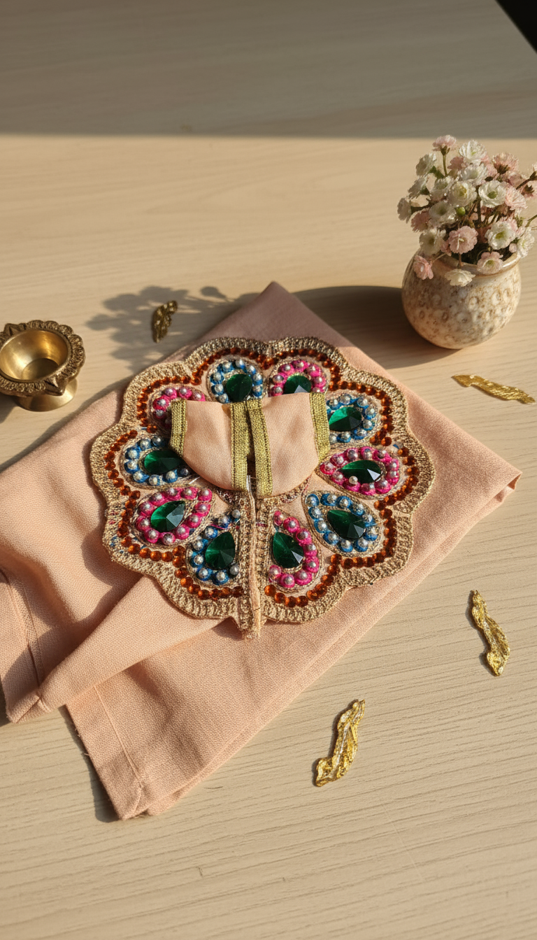 A Harmonious and Appealing Design: With its soft tones and lively gems, this dress is a wonderful choice for a tranquil yet beautiful devotional setting.