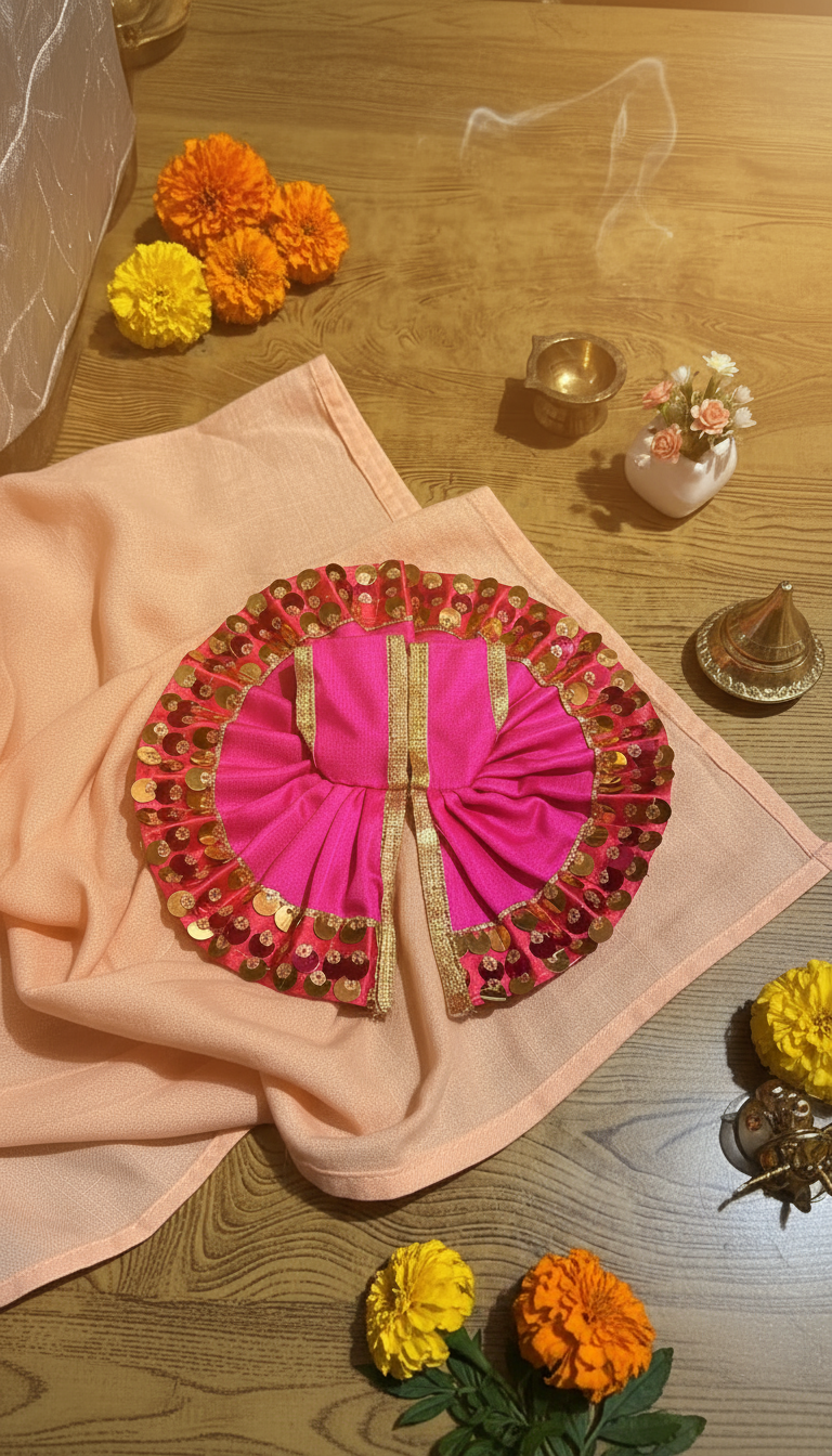 Vibrant Pink Dress: This lovely dress for Laddu Gopal is a bright and beautiful pink, making your deity look joyful and lively.