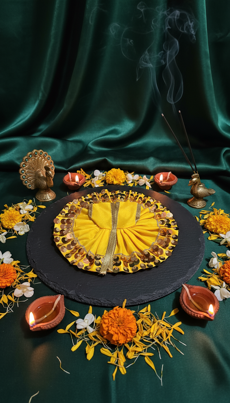 Festive Yellow Dress: This bright yellow dress for Laddu Gopal is perfect for celebrations, featuring a rich, radiant color that captures the spirit of joy and festivity.